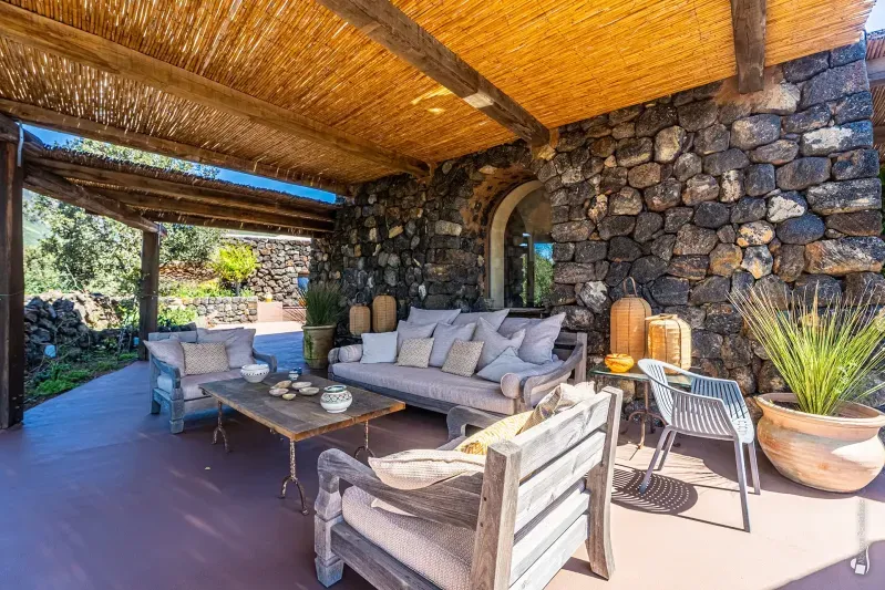 Outside, beneath a traditional cannizzo canopy, a charming outdoor kitchen invites guests to enjoy long dinners under the stars, surrounded by Mediterranean scents and soothing silence. In a discreet yet panoramic spot, a stone plunge pool offers a refreshing escape during the warmer hours or the perfect setting for an aperitif at sunset – a magical moment that only Pantelleria can deliver.