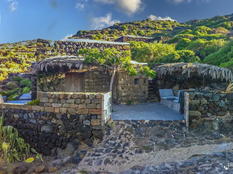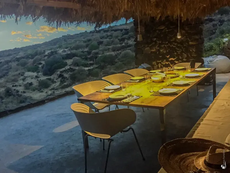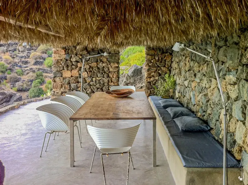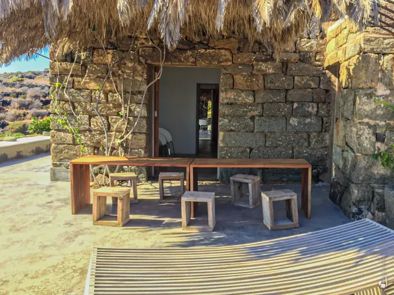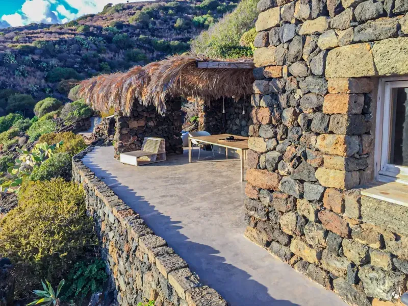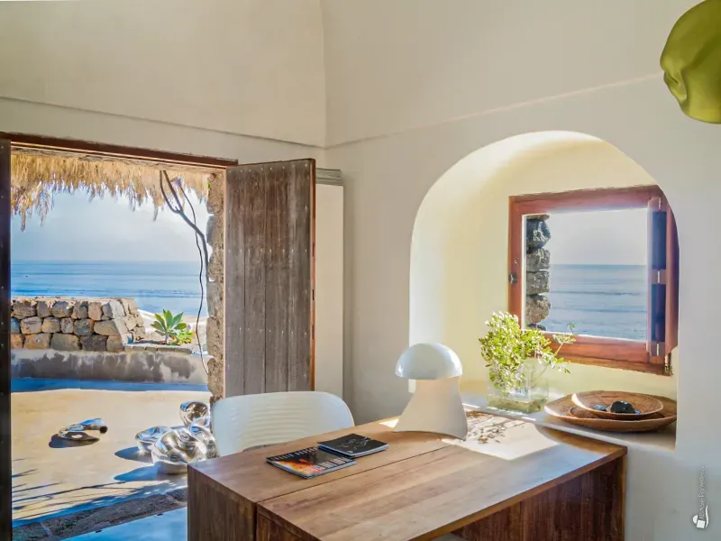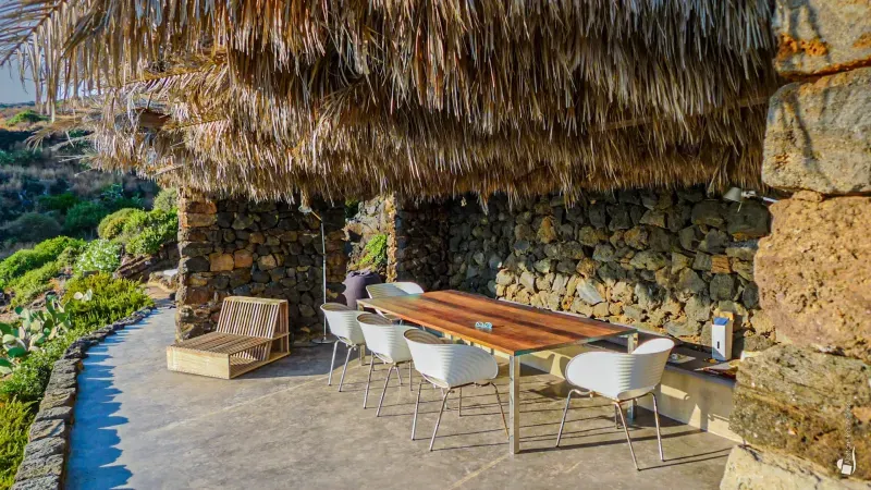 From the terrace you enter the first dammuso, where a comfortable living/study area welcomes you. This leads to the fully equipped kitchen, opening onto a stunning panoramic terrace shaded by reeds and palms. A large table invites unforgettable dinners overlooking the sea, while stylish sun loungers offer an irresistible alternative for daytime relaxation.