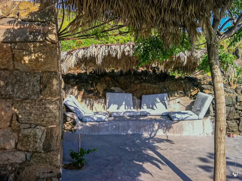 Access is via an ancient unpaved track which, through a wooden gate, leads to the first level of the property. Here you will find a delightful relaxation area, ideal for reading or enjoying a quiet pause in the shade of a pergola made of palm leaves, softened by generous cushions.