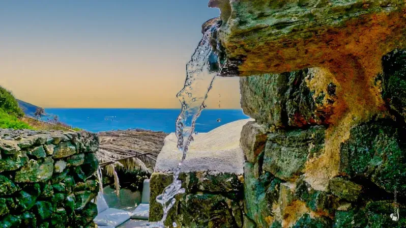 The setting is simply extraordinary: enjoying a commanding position above the charming little harbour of Nikà, the property lies just 30 metres from the sea. Within a few steps you reach a spectacular access to the water and, a little further on, the renowned cove of thermal spring waters — a unique place where time seems to slow down.