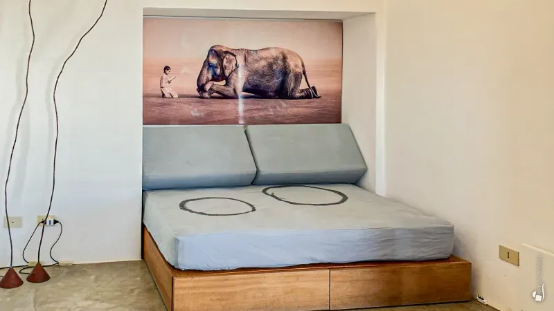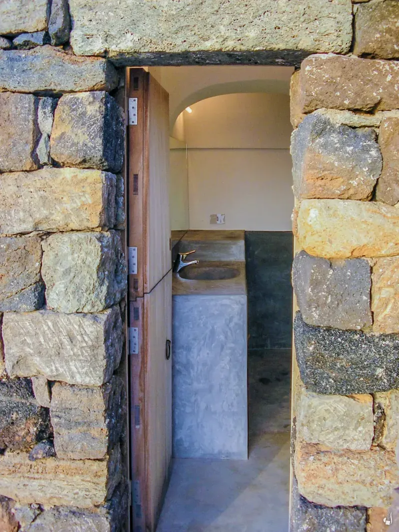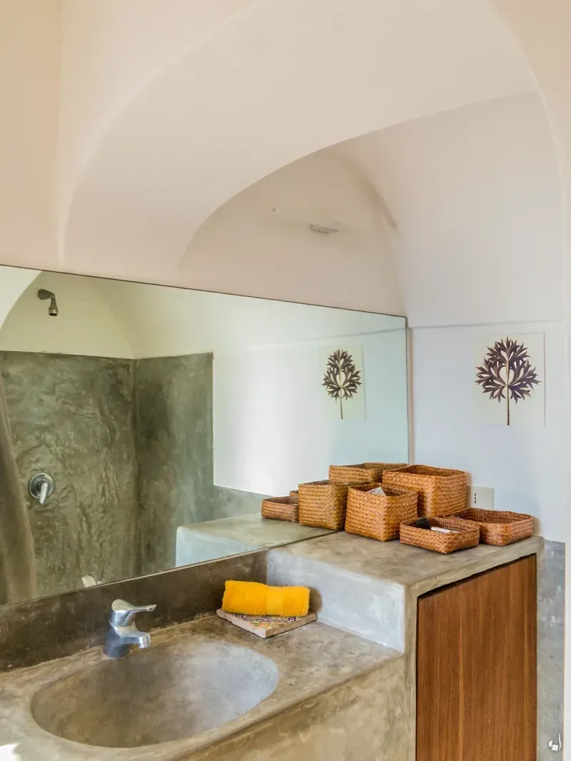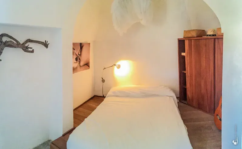 The bedroom is also accessed from the living area. This first building is surrounded by terraces, small gardens and intimate relaxation corners furnished with cushions and poufs, as well as a barbecue area and a refreshing outdoor shower. The main bathroom is accessed exclusively from the living terrace and makes use of the outdoor shower.