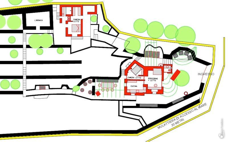 A few lava-stone steps lead up to the second terrace, where the second dammuso is located. It houses a double bedroom with en-suite bathroom and shower, a private entrance, a shaded terrace and a solarium.