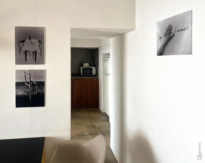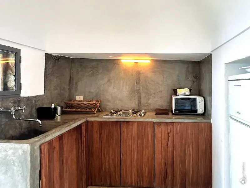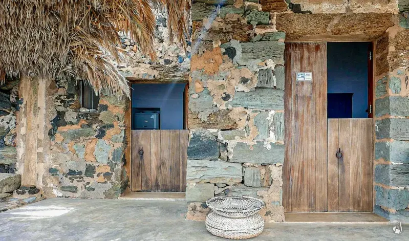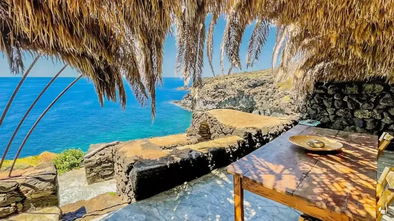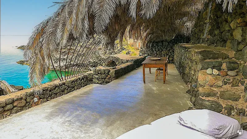 From here, the main terrace opens out, shaded by palm leaves, with uninterrupted views over the endless blue of the sea. Behind it, three doorways lead into the interior spaces: a functional, well-equipped kitchen, a double bedroom with a small sitting area, and a bathroom.